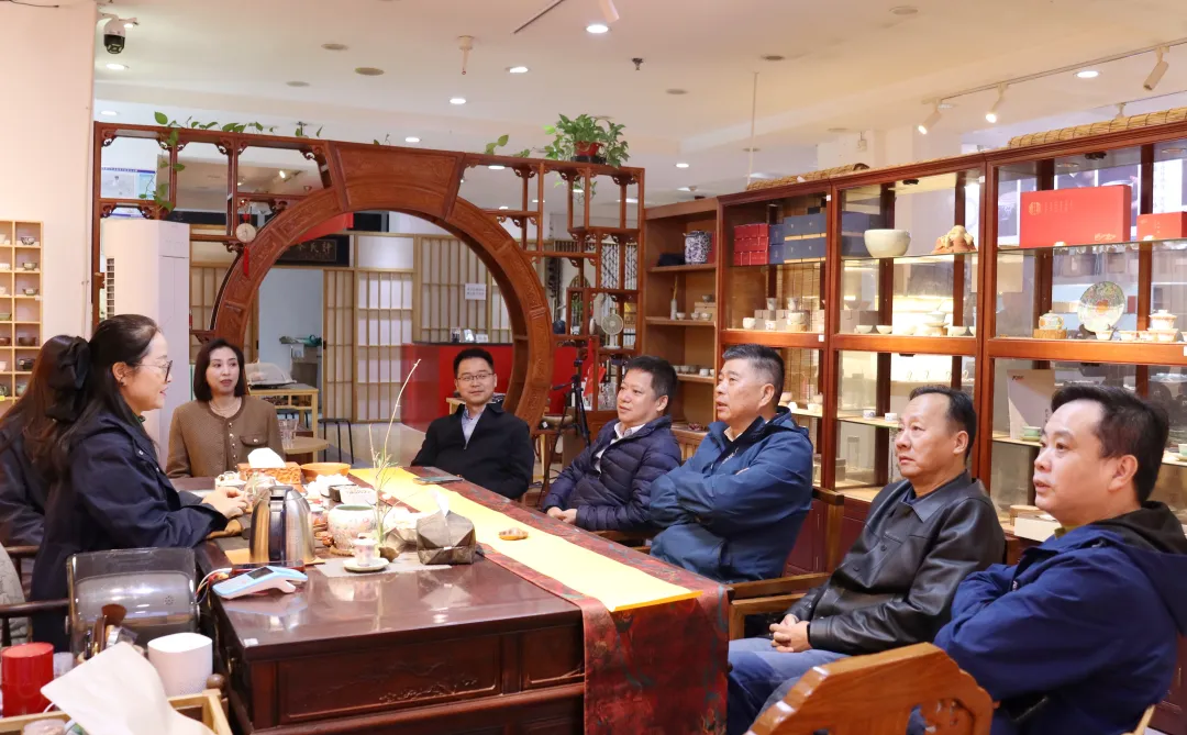 随后,走访团来到武汉许氏茗理茶艺品有限公司,总经理许琴热情接待并介绍了企业发展历程。许氏茶艺扎根武汉二十一载,专注于茶叶、茶具及茶家具经营,是湖北地区最具有代表性的茶文化企业之一。